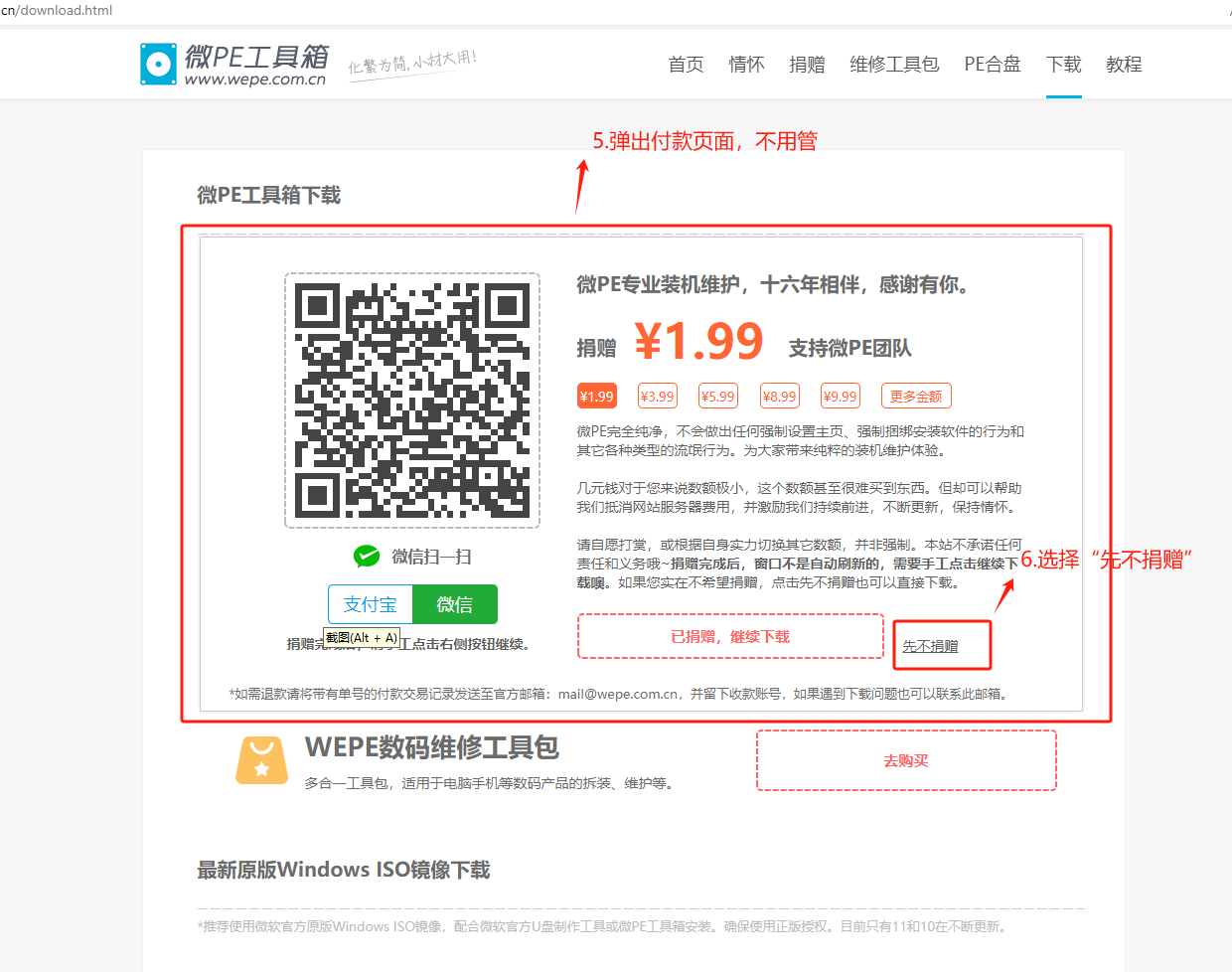 不用付款,选择“先不捐赠”