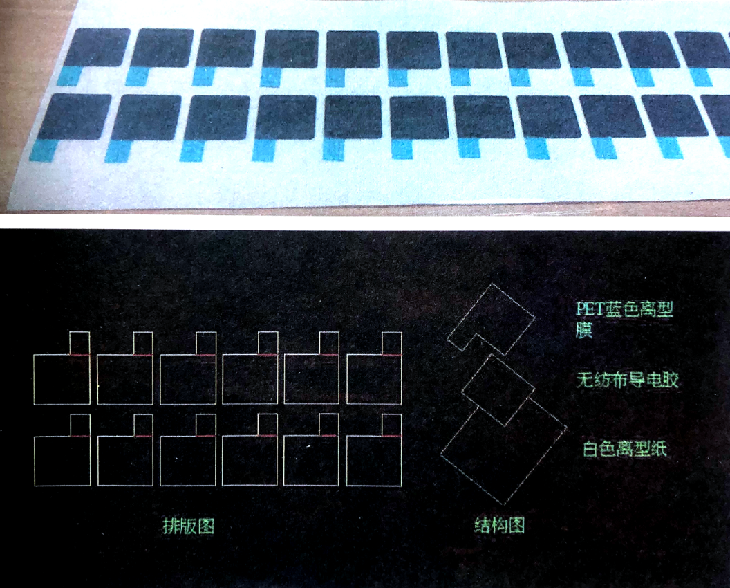 o 材料:低粘模+蓝色PET离型膜(75g) +导电双面胶+80g白色格拉辛离型纸。