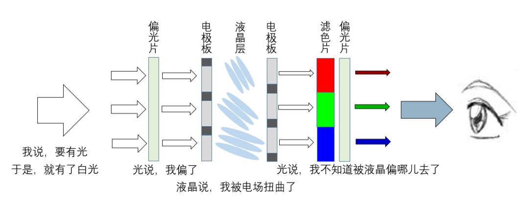 但屏幕显示内容会变化,也就是需要调节背光,这通过液晶层(liquid-crystal)来实现。而在这之前,我们先给屏幕加两张偏光片(光的偏振呢,就只能自己去翻物理书了,我也不懂),一张竖直、一张水平。背光通过第一张偏光片时,只有与偏光片偏振方向相应的部分光能通过,但由于方向与第二张偏光片垂直,所以无法通过,屏幕是黑的。