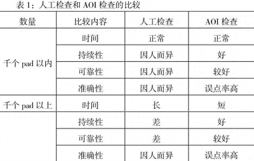 相比于人工检查,AOI检查的持续性、可靠性更好,具体见表1。总结AOI技术特点如下:一是检测速度快,和PCB板的印刷密度无关;二是可进行快速便捷编程,利用元件数据库对测量数据进行编辑;三是多功能检测算法、二元或灰度水平光学成像处理技术作为辅助;四是可根据PCB板的位置变化,自动化校正检测窗口,提高精准度;五是可在PCB板上使用墨水做标记,或在显示界面上标记图形,对检测结果进行核对。