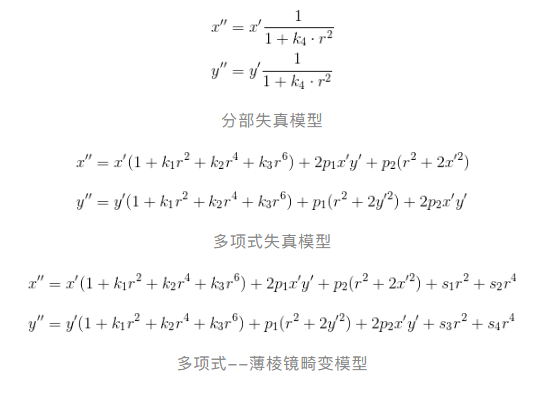 失真模型类型与OpenCV兼容,并使用标准化图像坐标用方程表示: