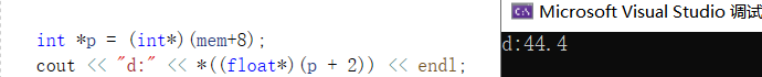 这里p+2表示按照指针类型移动2个位置,int是4个字节,所以内存上总共移动8个字节,到了d的位置,虽然位置对了,但是d不是一个int类型,按照int去解释是错误的。所以我们把类型解释成float。