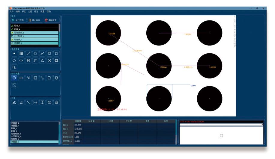 软件控制模块是整个系统的核心,现代数码显微镜配备了先进的测量软件,具备自动寻边测量功能,可根据取点范围,自动识别线、圆、弧,具有很强的去毛边能力。这极大地提高了线距、线夹角、圆半径、弧半径的测量精度,有效避免了人工误差。