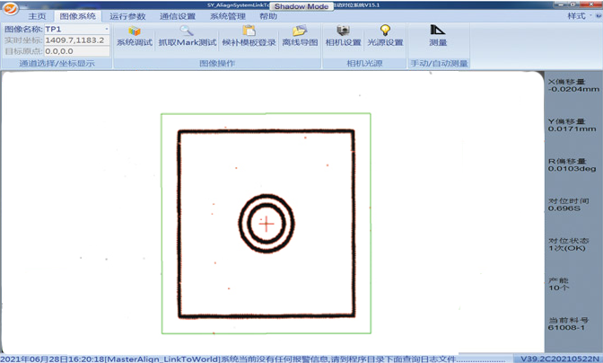 在界面中,操作者可以清晰地看到相机实时拍摄的画面。系统会自动标示出识别到的标记点,并直观地显示出当前的计算偏差以及贴合结果。