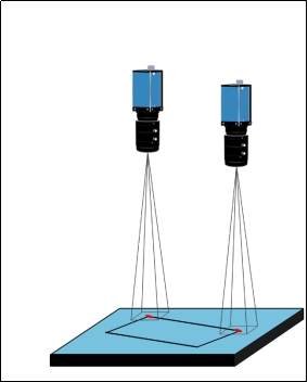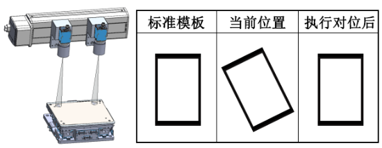说明:双相机模型两个相机分别拍摄产品的两个Mark点。平台端的产品来料位置不固定,找出两个Mark点后。根据纠偏算法找到偏移量,根据偏移量将平台端的产品对位到基准位置上(丝印基准位置)。