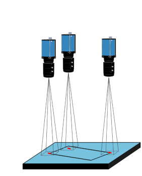 说明:三相机模型的三个相机分别拍摄产品三个Mark点,平台端的产品来料位置不固定,找出三个Mark点,根据纠偏算法找到偏移量,根据偏移量将平台端的产品对位到丝印基准位置上。