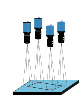 说明:四相机模型的四个相机分别拍摄产品四个Mark点,平台端的产品来料位置不固定,找出四个Mark点后,根据纠偏算法找到偏移量,根据偏移量将平台端的产品对位到丝印基准位置上。