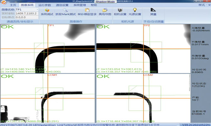 视觉软件采用像素级图像处理算法,在毫秒内实时解算出两者在X、Y、Z(高度)及Rz(旋转)四个自由度上的偏差数据。这些数据通过高速以太网实时传输给高精度六轴调整平台,驱动其在光学胶完成最终压合前的瞬间,完成动态位置与姿态的补偿纠偏。
