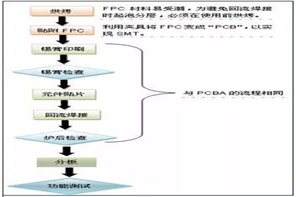 此类生产方式的重点是FPC的贴附/和固定。FPC贴附的目的就是利用夹具把FPC变成“PCB”,使FPC能像“PCB”一样进行SMT。其简化的工艺流程为: