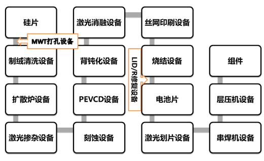 应用金属穿孔卷绕技术进行激光打孔,将电池正面电极搜集的电流通过孔洞中的银浆引导背面,而消除正面电极的主栅线,从而减少正面栅线的遮光。由于MWT电池较为小众,该设备仅在日托光伏等企业有少量应用。