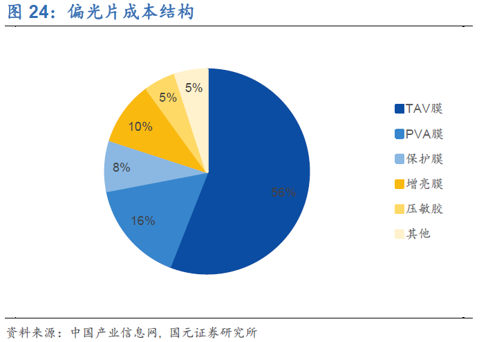 TAC 膜是偏光片另一重要原材料,占偏光片总成本的 54%。TAC 膜充当 PVA 膜的支撑体,保证了 PVA 膜的延伸不会回缩,另外 TAC 膜还具有优异的耐紫外线、耐 酸碱特性,保护 PVA 膜不受到水汽、紫外线等外界环境因素损害。PSA(压敏胶) 是偏光片贴合在 LCD 面板上的胶材,决定了偏光片的粘着性能以及贴片加工性能。偏光片按照 PVA 膜的拉伸工艺可以分为干法拉伸和湿法拉伸两大类。干法拉伸工艺是对 PVA 膜先进行拉伸,后进行染色、固色、复合、干燥等工艺;而湿法拉伸是将 PVA 膜先进行染色,在溶液中进行拉伸、固色、复合、干燥等工艺。目前偏光片 厂商主要是以湿法拉伸技术为主。