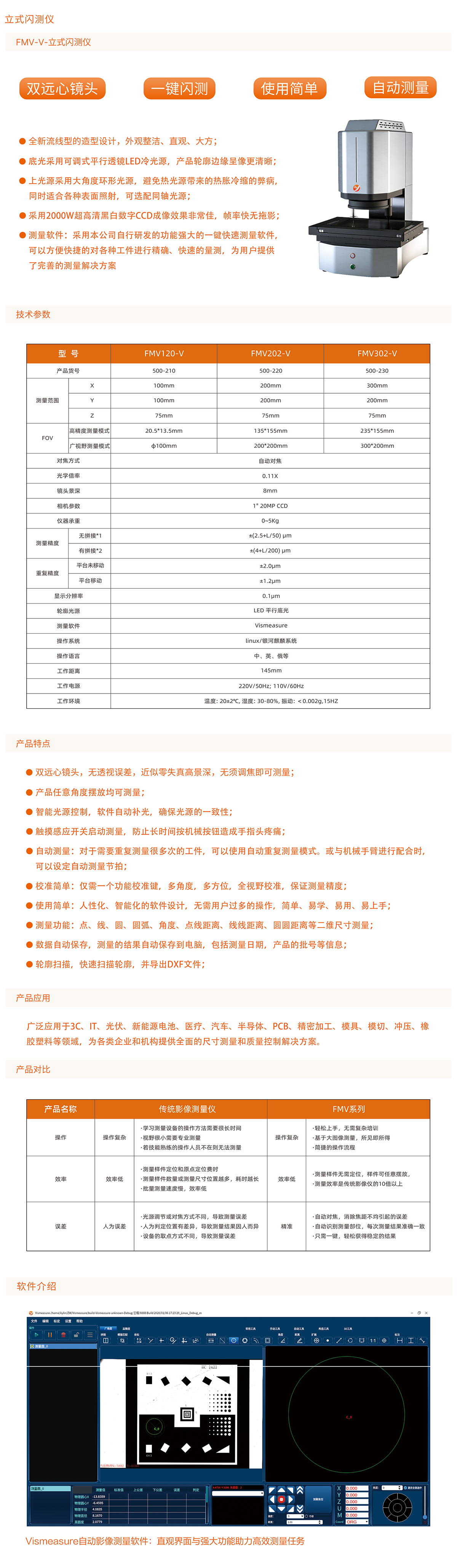 全新流线型的造型设计,外观整洁、直观、大方,底光采用可调式平行透镜LED冷光源,产品轮廓边缘呈像更清晰;上光源采用大角度环形光源,避免热光源带来的热胀冷缩的弊病,同时适合各种表面照射,可选配同轴光源;采用2000W超高清黑白数字CCD成像效果非常佳,帧率快无拖影;采用双侧远心镜头,视野大,畸变小,可选配双视野远心镜头;测量软件:采用本公司自行研发的功能强大的一键快速测量软件,可以方便快捷的对各种工件进行精确、快速的量测,为用户提供了完善的测量解决方案
